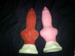 У меня есть их два дога ранних выпусков, которые были перепроданы некими торгашами дилд деревянными, с рынка лол. Один малинового цвета из отвратительного силикона, второй из оранжевого и получше. Малиновый который, просто отвратительный, силикон отстойнейший, надорвался у основания узла и вообще закинут в дальний угол дилдохранилища как потенциальный метательный снаряд из окна. Оранжевый же из силикона несколько получше, но всё равно не очень. Хотелось экзотики, потому качество силикона при покупке в приоритете не стояло. Жду православного БД, приедет -- запилю сравнительные фотки. Если с Флинтом к доктору не попаду, ха-ха.