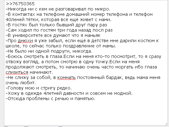 Отметил одно ДР в компании друга лет 12 назад (МАМКА ЗАСТАВИЛА, ёбаный стыд). Новый год отмечаю только с семьёй. Не бывал ни на чьих днях рождения, свадьбах и прочей залупе. Всех ёбаных дальних родственников и друзей семьи, которые имеют наглость переться в нашу квартиру на зазывания мамки, успешно избегаю под видом "а я типа спал)))". Если встречать их некому, то выхожу с еблом "вас тут не ждали", показываю где жрать, где срать и сваливаю играть на комплунктере. В соцсетях говорю только с сестрой с фейковой странички. IRL полторы друзяфки. Онлайн - две, о которых я почти ничего не знаю на протяжении семи лет. Если получается завести случайную беседу онлайн, то я всегда первый, у кого "дела кароч тут, я пошёл)))". Выхожу из дома только до магазина через дорогу, при этом надеваю головные телефоны и отмораживаюсь от окружающей обстановки. Если кто-то незнакомый ВТОРГАЕТСЯ в личное пространство, начинаю буянить, хотя дрыщ ещё тот. Не могу смотреть в глаза мимокрокодилам. Да даже друзьям. Никогда не общался с противоположным полом, кроме родственниц и продавщиц. Какое уж тут держание за ручку. Если бы хотел что-то изменить, то сделал бы, но мне всё это норм. 29 лвл.