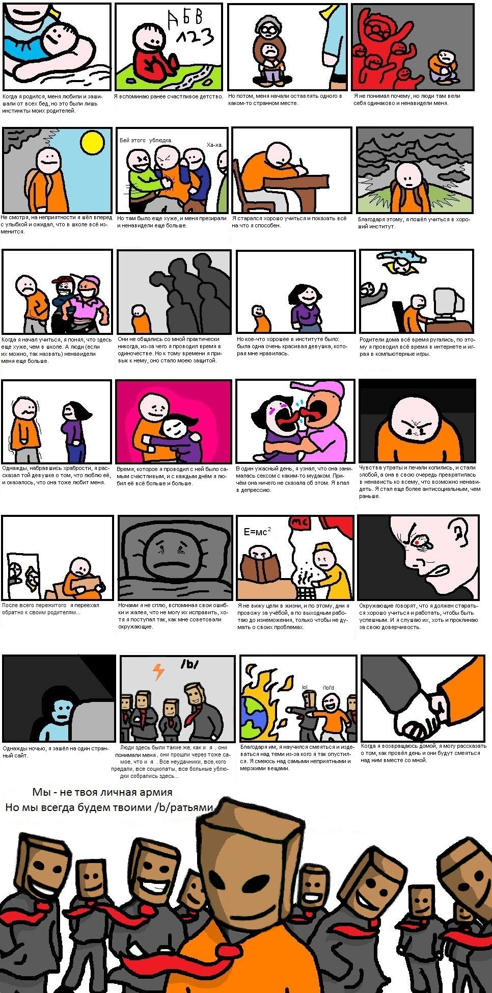 Эй, анон, привет! Не грусти, ведь я с тобой. Ты тот самый одинокий парень, который постит грустную лягуху и рассказывает свою историю. Ты отписываешься о чём-то с ненавистью, чему-то выражаешь поддержку. Сагаешь, бампуешь. Я хочу тебя обнять, подбодрить. Не хочу, чтоб ты страдал. Ты будешь счастлив. Я люблю тебя, анон.