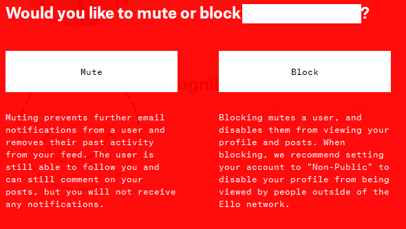 Block - Блокирование отключает пользователя, и отключает их от просмотра вашего профиля и сообщения. При блокировании, мы рекомендуем установить свой аккаунт на «непубличных», чтобы отключить свой профиль от просмотра людей за пределами сети Элло.