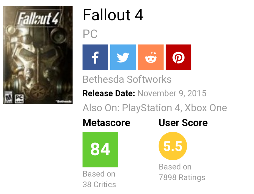 >>185531229 Обзоры пользователей нихуюшеньки не показатель. На метакритике тебе не нужно доказывать что у тебя есть игра чтобы писать обзор и ставить оценку. Возьмем например Odyssey - 76% настоящих покупателей сказали что им игра понравилась, в то время как на метакритике юзерскор 5.0 и больше половины отзывов - нолик и стандартная фраза "кококо тут кароч микратранзакции))" как им скаазал обзорщик на ютубе. Это не касается фоллаута 4, потому как его скор в стиме 69% (хотя мне лично игра понравилась).