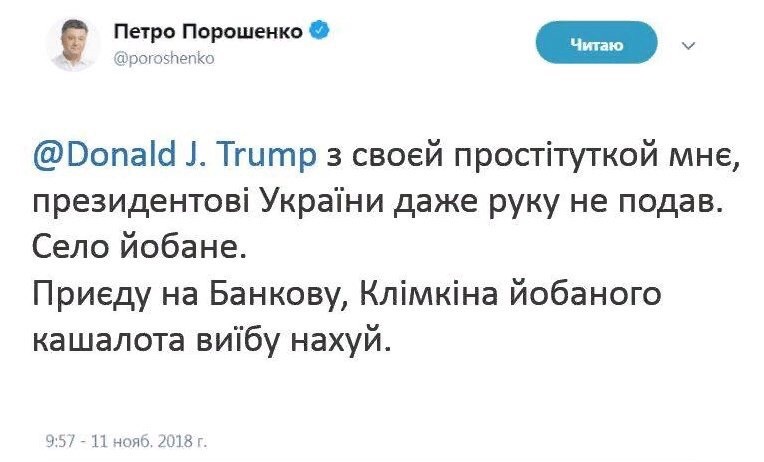 Почему друсня всегда обсирается? Вчера так носились чтобы Трамп пожал руку путену, в итоге выставили себя на помешище, трамп одернул руку после, а в сети все смеялись какой пыня жалкий. А вот Порошенко забил на это, зато успел провести встречу и договориться, вот что значит работает человек
