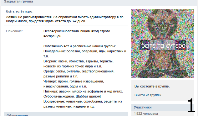 >>77127415 Не совсем, всё слишком претенциозно. Сатана на аватарке, арамейский(?) вместо названия. Всё кричит о том, мол, смотрите, как всё запретно и закрыто, но при этом доступно. Практических пояснений к картинкам практически нет, просто шок-контент. Видно, что администрация передёргивала на себя любимых, когда создавала эту группу.