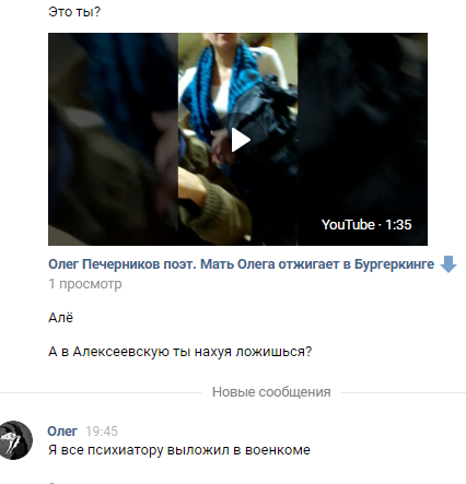 Олег, ты? Помнишь меня? Я твой одноклассник. Я узнал тебя по твоим шизоидным словам и высерам. А помнишь, как мы всем классом нассали тебе в кружку в третьем классе, на сладкоежке? Ты ещё выпил, облизнулся и попросил добавки. А потом тебя пришёл забирать твой отец, тот самый дворник, который на Вернадского изнасиловал кошку и получил условный срок за то, что украл плавленный сырок в магазине. Он зашёл в класс, все стали смеяться, а ты обосрался под себя от стыда, а потом сказал, что всю жизнь будешь ненавидеть дворников, но в 9м классе, когда ты пошёл на рейд, чтобы их отпиздить, то они пустили тебя по кругу, после чего тебе наложили на анус восемь швов. Как поживаешь, Олежа?