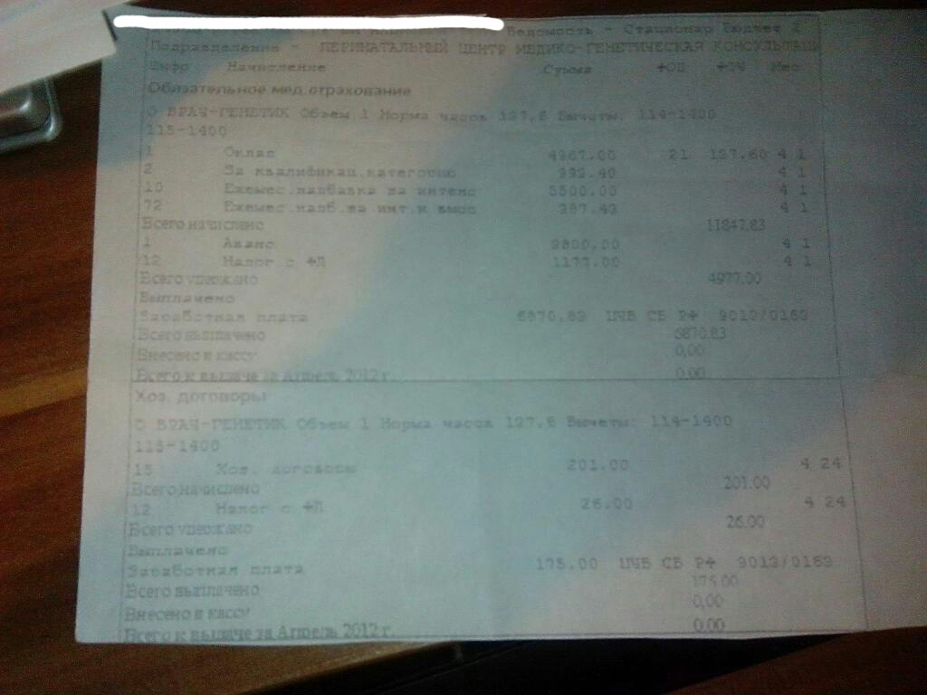 Месяц: Апрель, 2012 Регон: Воронежская область Специальность: врач-генетик Должностной оклад: 4 967.00 Руб. Зарплата на ставку: 10307.61 Руб. Зарплата: 11 847.83 Руб. Зарплата без налогов: 10307.61 Руб. Количество часов на ставку: 137.60 часов Отработано часов всего: 137.60 часов