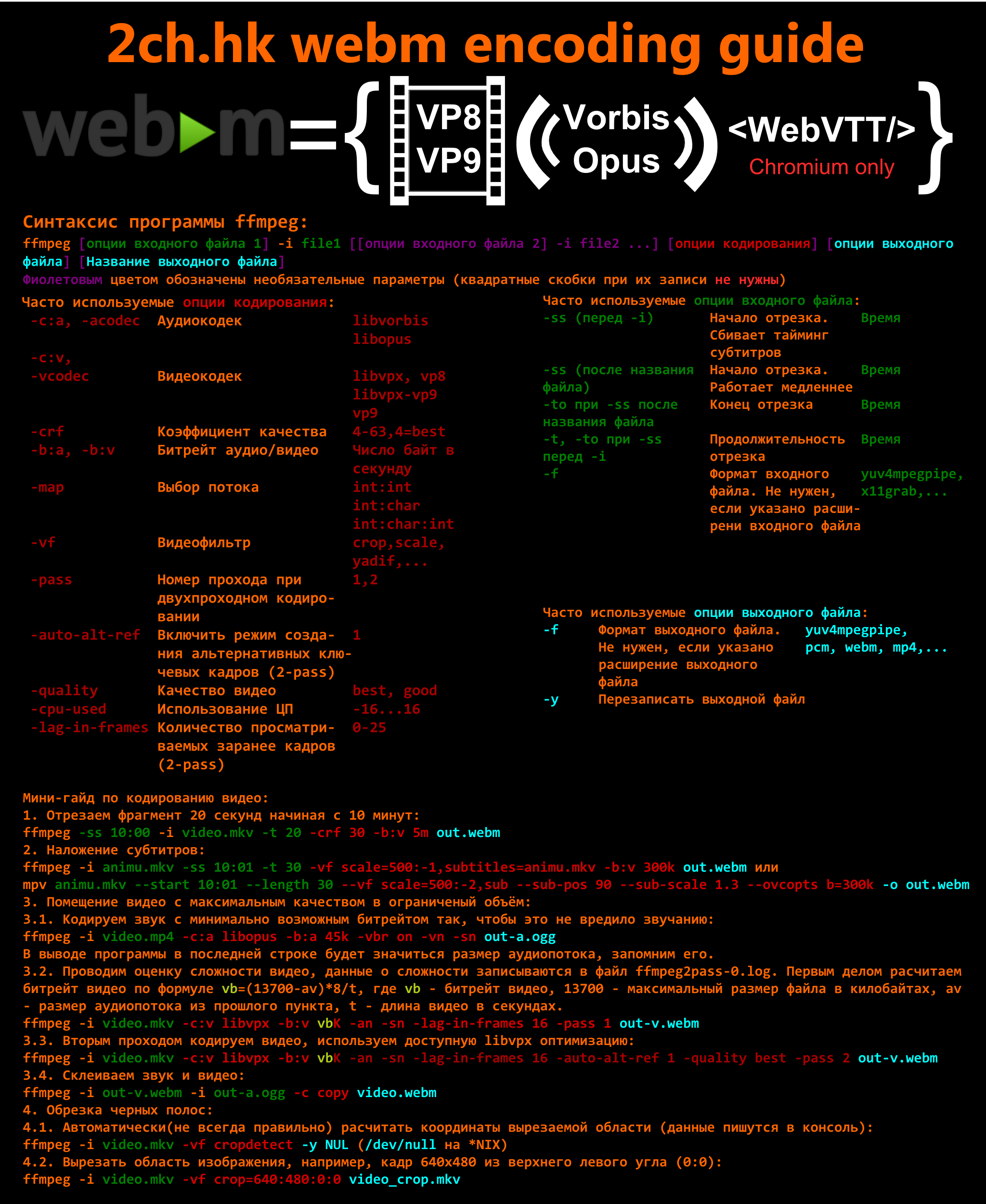 Анимублядский WebM-тред для приличных анимублядей и прочих аутистов. Безграмотное быдло с рудабом, порнографией, мокрыми письками, домашним видео с котиками и прочей ерундой, а также хэйтеры и вниманиебляди различных мастей отправляются в порнотред >>77158855. Тред техподдержки (оп-пост устарел): https://2ch.hk/s/res/1035239.html Обсуждение припадочных модераторов: https://2ch.hk/d/res/170893.html Филиал треда с большими WebM'ками (до 20МБ): http://2ch.hk/f/res/22235.html Если браузер вместо воспроизведения отдельных видео ругается на повреждённый видеофайл, либо не воспроизводит звук — он скорее всего не может в VP9 или Opus. См. http://en.wikipedia.org/wiki/HTML5_Audio#Supported_audio_codecs Хромоги с зондом 36 версии, а также пользователи браузеров на его движке сосут на вебмках с Opus'ом, смуксенных при помощи mkvmerge. Для поиска соуса видео сохраняем кадр (правый клик по видео) и ищем его на http://images.google.com. О кодировании WebM Доступные кодеки — VP8 (libvpx, vp8) или VP9 (libvpx-vp9, vp9) для видео и Vorbis и Opus (libvorbis и libopus) для звука, максимальный размер файла — 15360КБ, всех файлов в посте — около 22МБ. Внимание: libvorbis'у нельзя указывать фиксированный битрейт (-b:a) — это сильно портит качество звука. Opus'у наоборот указывать битрейт необходимо. При кодировании видео с помощью старых версий ffmpeg со звуком Opus нужно указать -strict -2 в качестве параметров кодирования. Внимание: ffmpeg неэффективно муксит Opus, итоговый файл получается на 10-20% больше, чем с mkvmerge. Наложение субтитров Данная операция требует настройки кэша шрифтов в ОС Windows: https://github.com/AlsaAsksMiley/webm-thread-misc/blob/master/Fontconfig_and_subs.txt Внимание: параметр -ss ffmpeg'а следует указывать после входного файла, иначе тайминг субтитров будет считаться от начала фрагмента. В git-версии фильтр subtitles ffmpeg'а научился брать шрифты из контейнера и понимать параметр si (номер нужного потока с субтитрами). Ссылки Основные понятия сжатия видео: https://github.com/pituz/webm-thread/wiki/glossary Программы и их документация: http://ffmpeg.orghttp://mpv.iohttp://www.bunkus.org/videotools/mkvtoolnix/ Гуй с минимумом кнопок для ретардов (сперма-only): https://github.com/WebMBro/WebMConverter/releases Оп-паста, исходники пикчегайда и оп-webm'а, скрипт пиления webm'ок на zsh: https://github.com/pituz/webm-thread/