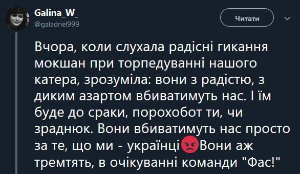 >>30843003 >Вчора, коли слухала радісні гикання мокшан при торпедуванні нашого катера, зрозуміла: вони з радістю, з диким азартом вбиватимуть нас. І їм буде до сраки, порохобот ти, чи зраднюк. Вони вбиватимуть нас просто за те, що ми- українці Вони аж тремтять, в очікуванні команди "Фас!" Да. Так и есть. С удовольствием. И пожрать потом, стоя над трупами.