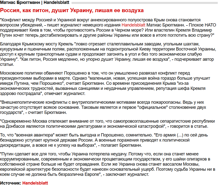 Handelsblatt Россия, как питон, душит Украину, лишая ее воздуха 28 ноября 2018 г. Конфликт между Россией и Украиной вокруг Крыма снова становится вопросом убеждений. НАТО поддерживает Киев в том, чтобы противостоять России в Черном море? Или Пыня хочет дестабилизировать и другие районы Украины или вовсе поглотить всю страну?