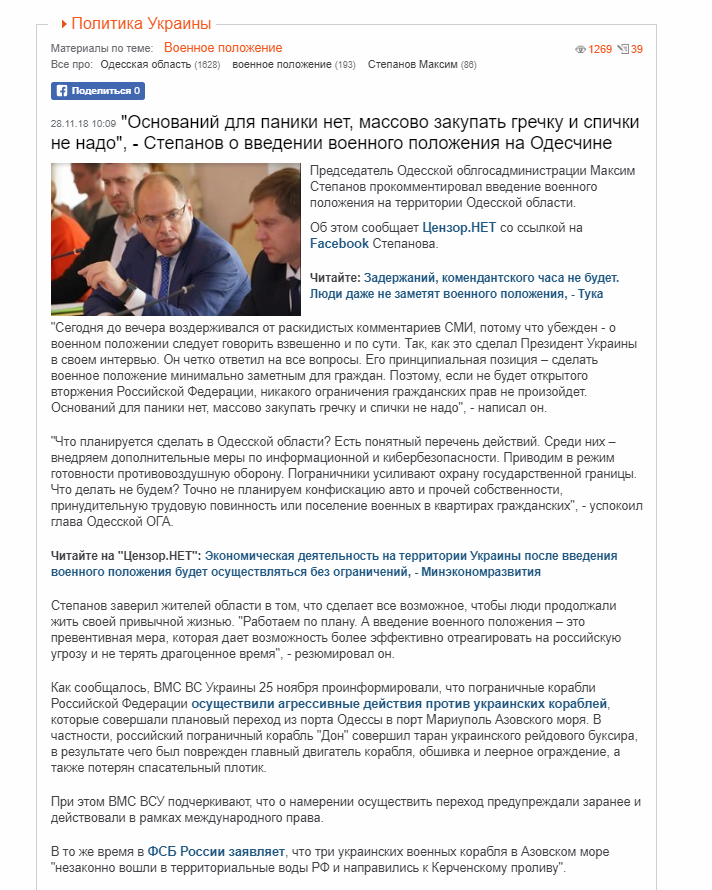 В воскресенье три корабля ВМС Украины нарушили границу РФ в Черном море и были задержаны российскими кораблями. На фоне инцидента в среду Киев на 30 дней ввел военное положение в 10 из 24 областей страны. Оно касается Винницкой, Луганской, Николаевской, Сумской, Одесской, Харьковской, Черниговской, Донецкой, Запорожской и Херсонской областей.