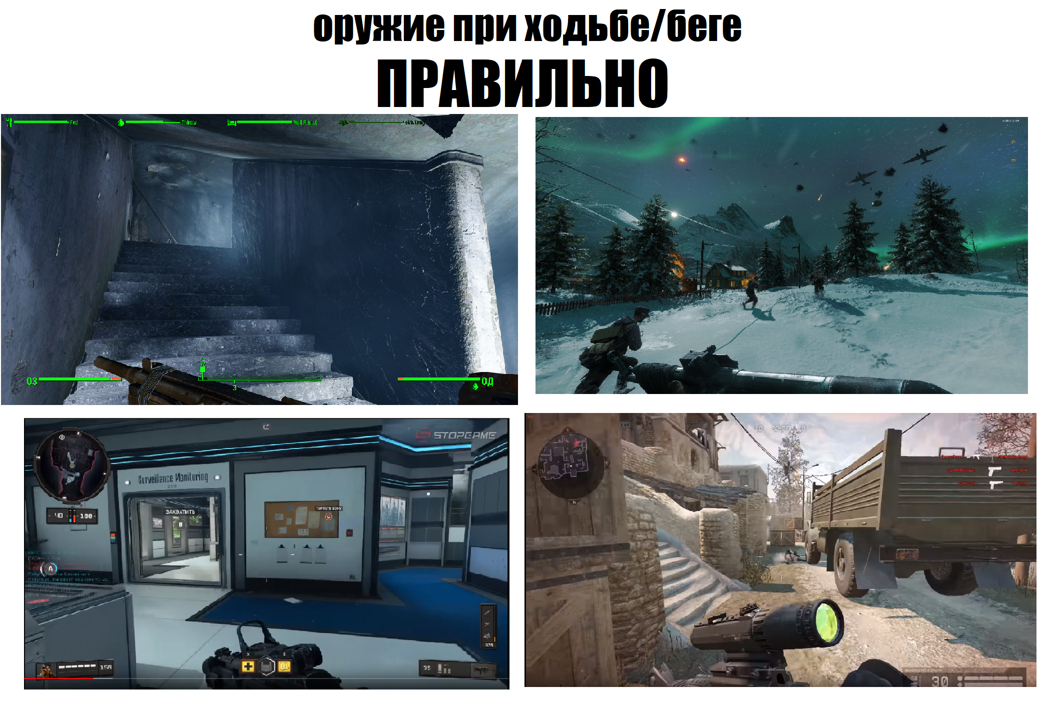 > Я понимаю что разработчики игр угощают говном, но ведь кто-то догадался и добавил пару нормальных анимаций. Когда идешь/бежишь то ствол не висит перед лицом, когда стреляешь с бедра то ты видишь максимум окончание ствола а не все оружие, и наконец когда прицеливаешься то ствол помещается по центру экрана.