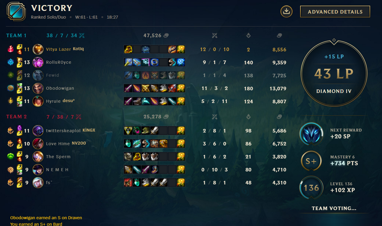 >>29978980 Я слишком завишу от морали просто. Когда я воодушевлён (как когда закрыл сессию), то изи иду с 80% вр на дивизионов 3 вверх. Не тильтую, аутджанглю платиноидов и тд. А когда нет поводов для радости, то наоборот тильтовахен, сгораю нахуй с одной-двух игр и тд. Вот сейчас я скорее такой сижу.