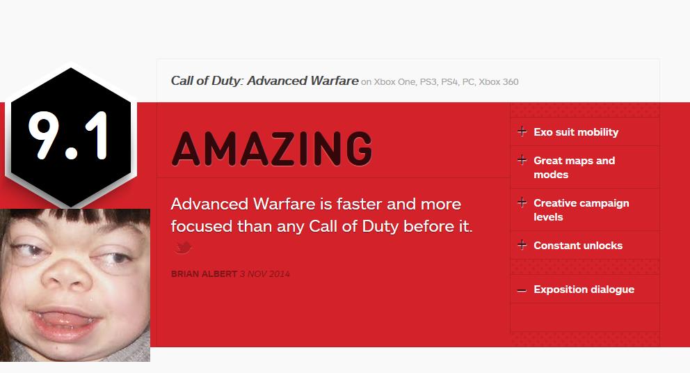 Прошел. Что могу сказать - это далеко не самый хуевый сингл, на голову выше MW3 и Ghosts, но, блджад, он чудовищно короткий. 4 ебаных часа. Вдумайтесь. 4 ЧАСА НЕ НА МИНИМАЛЬНОЙ СЛОЖНОСТИ! И это я не вычитал загрузки по 5 минут каждая, и умирал частенько. Не то чтобы я был зол, но купивших этот гумус искренне жаль. Я помню, что-то еще было такое жопоразрывающе-короткое. В общем, это чуть лучше последних КоДов, но все еще гумус. Надеюсь, Трешарчи напишут новый движок к следующему году.