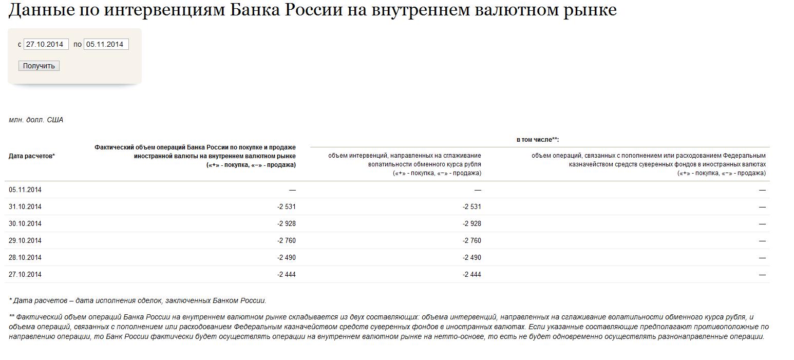 >Банк России объявил об отказе от проведения поддерживающих курс рубля неограниченных валютных интервенций. Начиная с 5 ноября 2014 года, ЦБ не намерен тратить на эти цели более $350 млн в сутки