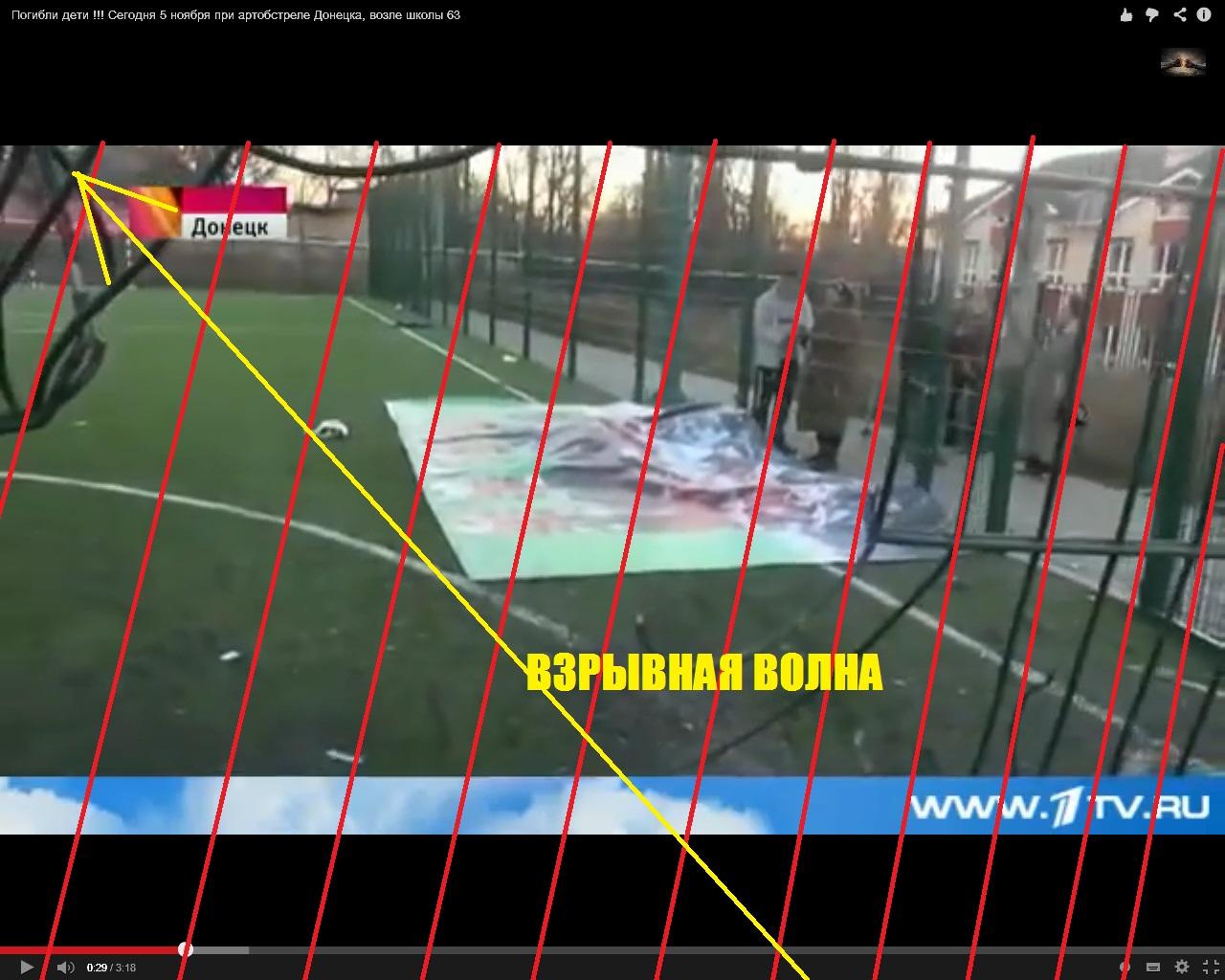 Снаряд, убивший двоих и ранивший еще нескольких детей на футбольном поле школы №63 в Донецке, прилетел с территории, контролируемой террористами, а не из села Пески, которое находится под контролем украинских войск. Это следует из анализа траектории его полета. Так, на Facebook-странице сообщества "Гуманитарный штаб "Поможем" размещена фотография, на которой стоит журналист российского "Первого канала" рядом с поврежденной оградой стадиона. На фоне мы видим дом с колоннами: http://1-ps.googleusercontent.com/x/www.pravda.com.ua/img.pravda.com/images/doc/3/7/379238e---------.jpg.pagespeed.ce.GwgcA8CDc5.jpg