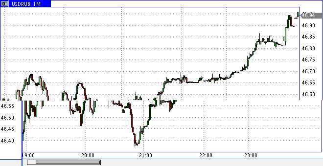 Вообще, если посмотреть трезво - то именно сейчас есть у него возможность отката к 45,5. Причина - в Украине гривну так же отпустили, получилось практически синхронно (рубль опоздал на день, вроде, всего). Только в отличии от России, за день сказали, докуда может допрыгать курс из-за "отложенного спроса".
