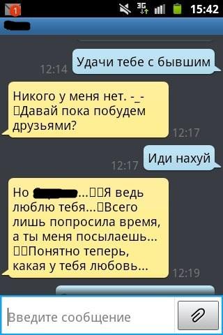 Потом еще долго пиздострадал, когда она не стала встречаться со мной. Потом общался с ней "по-дружески" и по-дружески, когда она опять позвала меня в кино, предложил ей купить мне билет, а я ей потом отдам. А то я не успеваю в кассу, а там все билеты раскупят. Согласилась. Норм сходили и я с тех пор ее игнорю. Пару раз писала мне и звала куда-то, но я отвечал на отъебись и постоянно придумывал слишком толстые отмазки, чтобы не ходить. До сих пор торчу ей 1.5к. за тот поход. Мне норм