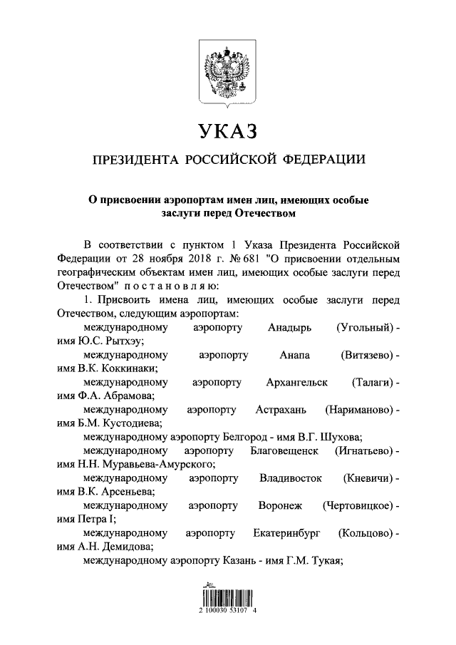 >>33018821 "...п о с т а н а в л я ю: 1. Присвоить имена лиц, имеющих особые заслуги перед Отечеством, следующим аэропортам: [...] международному аэропорту Мурманск - имя Николая II;"
