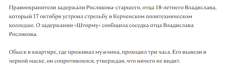 17 октября 2018 года Владислав Росляков устроил взрыв в Керченском политехническом колледже и открыл стрельбу по живым мишеням из ружья. Влад был вдохновлен бойней в школе Колумбайн. Погиб 21 человек, а также более 70 пострадали. Убийца покончил с собой в библиотеке.