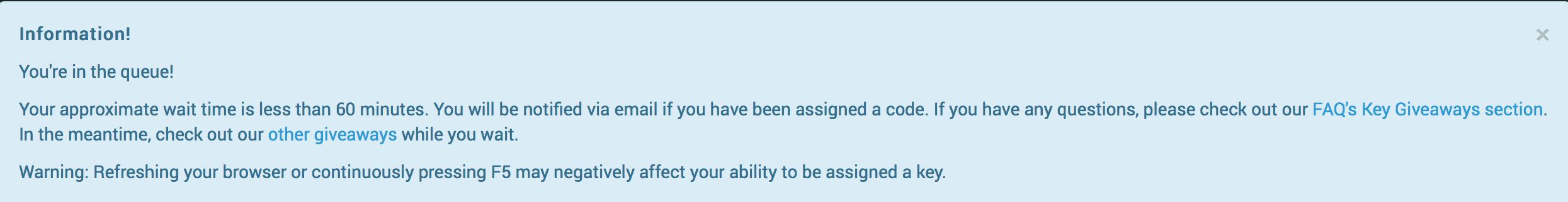 Warning: Refreshing your browser or continuously pressing F5 may negatively affect your ability to be assigned a key.