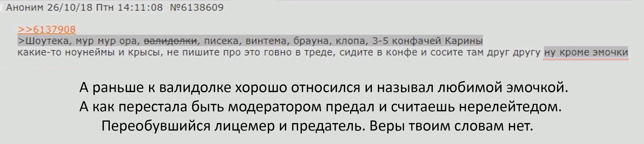 >>8048304 Самый обычный слив. Нечего сказать - пишет совершено другое. Выше пруфы с постами когда аноны рвались с этого говна в треде и оскорблений Карины. Не могли больше сидеть из-за них. На твоё мнение мне вообще похуй. Пишу как было. Попробуй это опровергнуть. Будет весело.