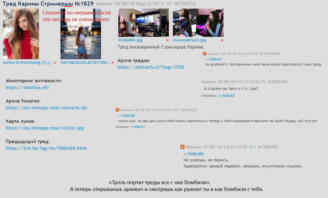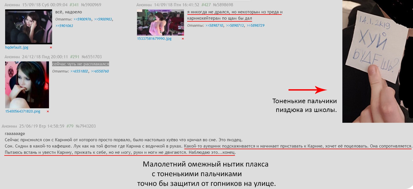 >как Карина относится к подобному. Какие у тебя пруфы,билли? Никаких. Карина никогда не говорила на стримах что она ненавидит трипкоды. Это чушь и выдумки залетного нюфена и шизофреника. Один знаменитый анон с трипом попросился в конфу и карина одобрительно ответила ему вокарушкой что возьмет. Этим фактом ты слит. Пруф 548 тред. А ты запруфать не сможешь и берешь фантазии из больной головы.