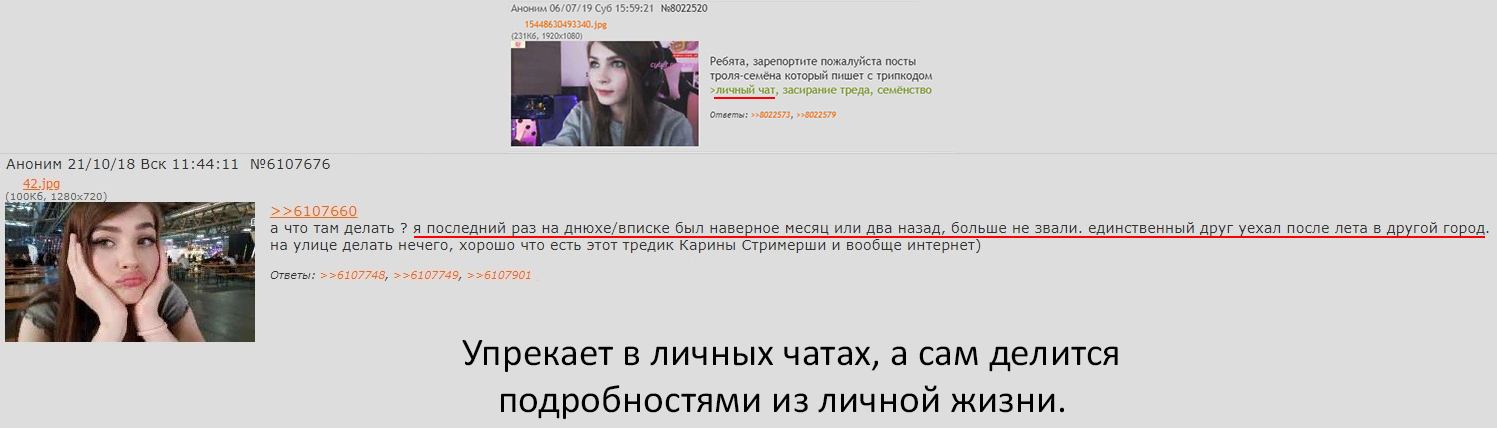 >Может Карина и относилась нормально к какому-то трипу Слился и начал маневры. Кончай с этими мантрами. В 2017 она плевала тред чтобы какой то хуйней заниматься удаляя посты и треды. Знаменитой стримерше по твоему делать нехуй? Она в 2016 сидела только потому что ей абу рекламу двача проплатил. Она без денег жопу не двинет что либо делать. Причина ухода не трипы и вниманиебляди,а бесполезность помойки. Дай ей миллионы от имени фага и она снова вернется сюда. Ах да ты же нищий чмошник который не сможет сделать это ради карины. Ты можешь только сопли пускать,ныть,стишочки, да бороться с тролями на которых ей похуй.