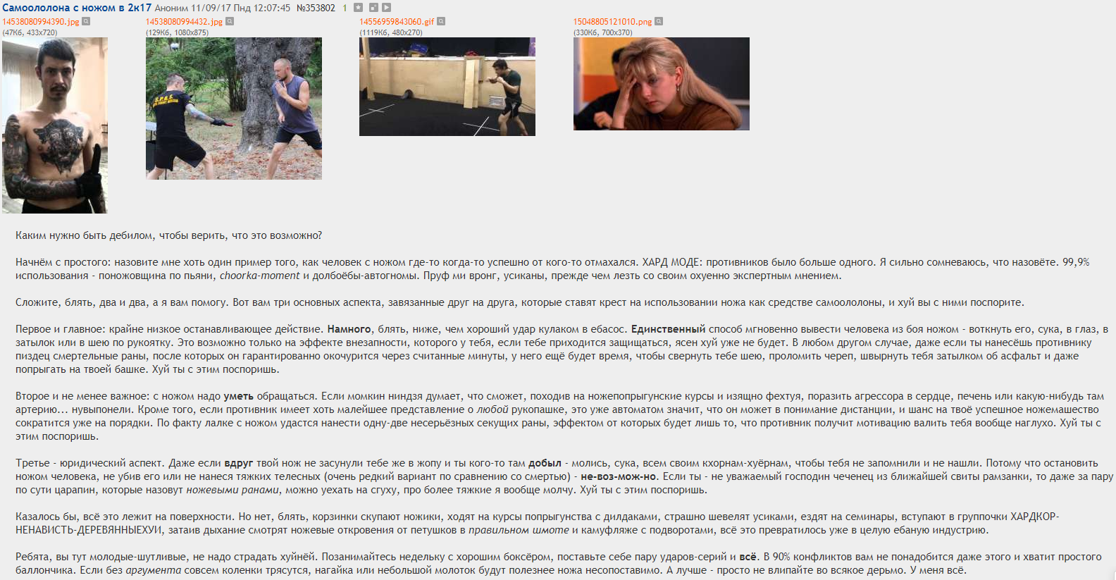 >>5620046 Один из примеров – эффективная (такая, чтобы c одного удара выводить противника из строя) самооборона для субтильных кунов/тянок. Тренировка стрельбы на поражение из короткоствола, колющих ударов клинком в печень. Найти кого-то трудно, ибо обычная реакция: ко-ко-ко, посодют, низзя "людей" убивать, пойди лучше в петушиный угол на бокс (ghj dtcjdst rfntujhbb) и прочее задросткое самбо для женатиков-куколдов.