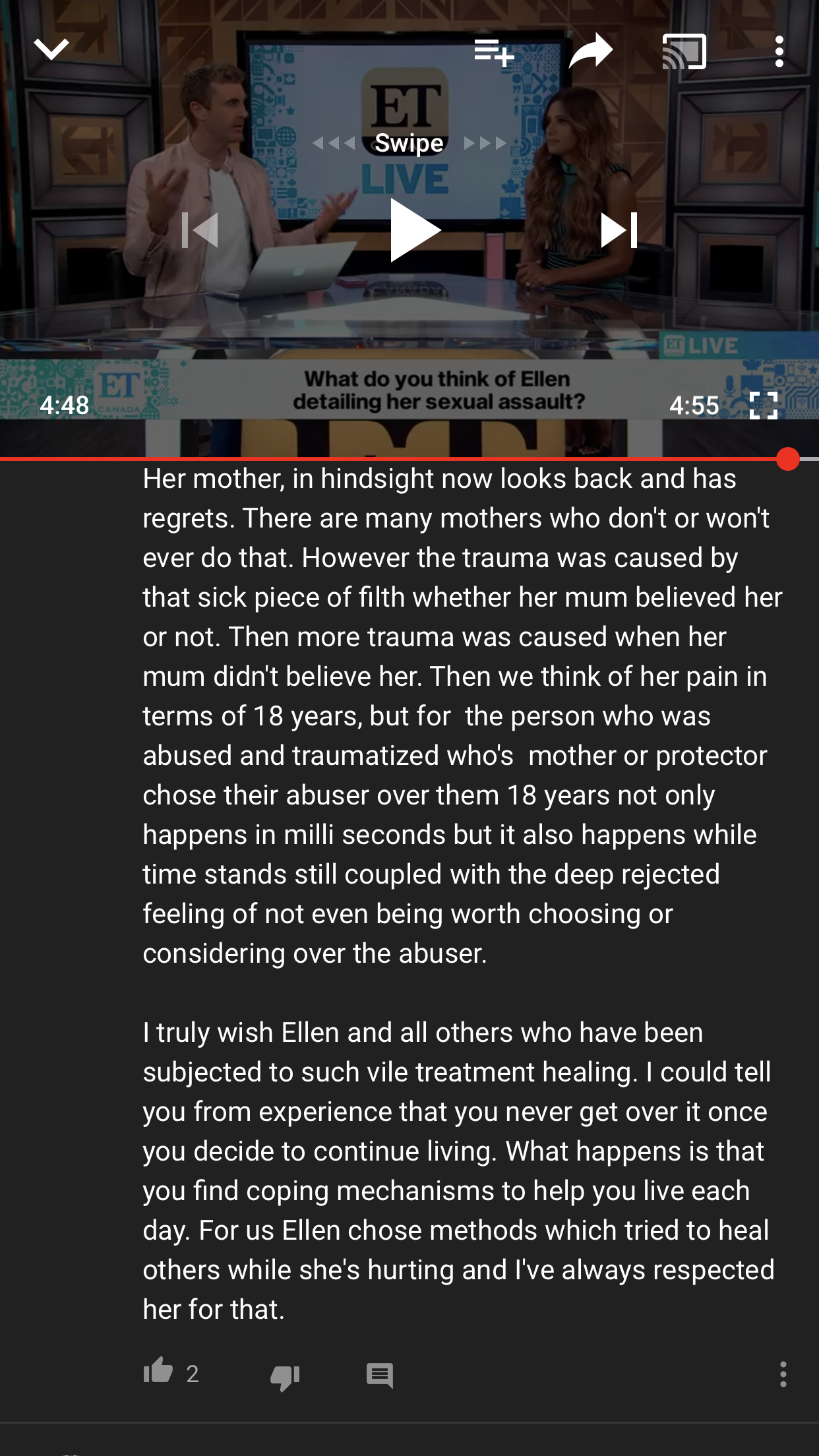 После этого рассказа на шоу Леттермана, мамка Эллен сделала заявление: «Я знаю, что после сексуального насилия самое сложное — рассказать. Я люблю свою дочь и я бы хотела, чтобы у меня была тогда способность услышать. Я живу с сожалением и я не пожелала бы этого никакому родителю. Если кто-то в вашей жизни найдет смелость открыться — пожалуйста верьте им»