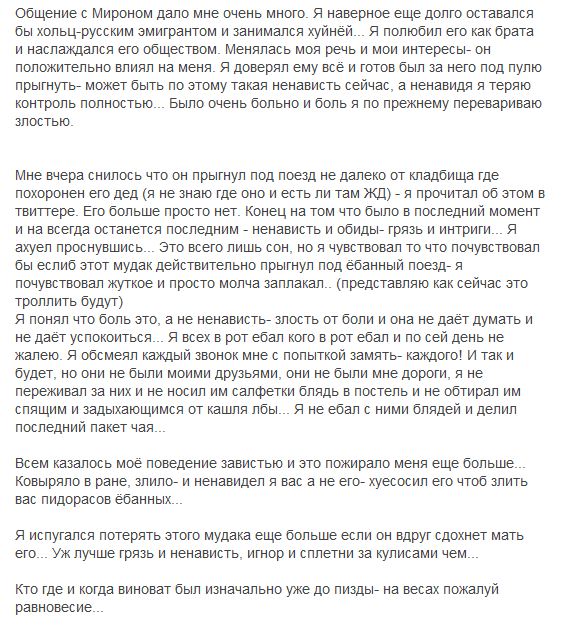 >>59589 Единственное за что я бы отсыпал щуккире шекелей, это если бы он занимался не выпуском ссаного мерча и каких-то переделок старых песен, а если бы просто взял и выпустил мемуары про Оксимирона и всякие воспоминания и как ему хуево что упустил такого чела.