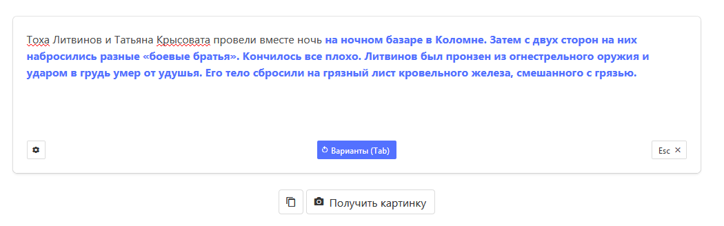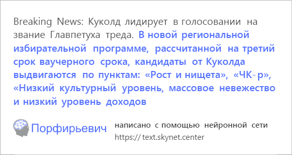 >>35437320 >отличный способ писать сюжеты Но всё как обычно скатывается в безудержную еблю. Однако как сказал бы Михал Сергеевич, начало положено, процесс пошёл и надо ухлубить. Залить в нейросеть терабайты текстов, от шумеро-аккадских мифов до фанфиков поехавших жирух по новым звездным войнам, затем вбить пару тройку тэгов для общей направленности и пусть нейронка выдаёт сюжеты. Генерирует новые текста нейронка сможет и на их основе генерировать новые и в итоге писателями со сценаристами пойдут на мороз.