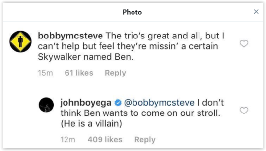 >>132411 А Бойега о том, как он хотел, чтобы Финн был крут, но чёт как-то meh вышло. А потом их имена таинственно пропали из анонса BR восьмёрки, кек. Все, кончайте, заебали.