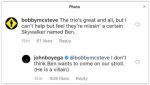 А чому все возбудились, что нейтральная гендерная передача названия 9-ки, как -то намекает на Рей? Ха. У нас действительно 2 Скайокера, мужчина и женщина. И это Кайло и его мама, Лея!