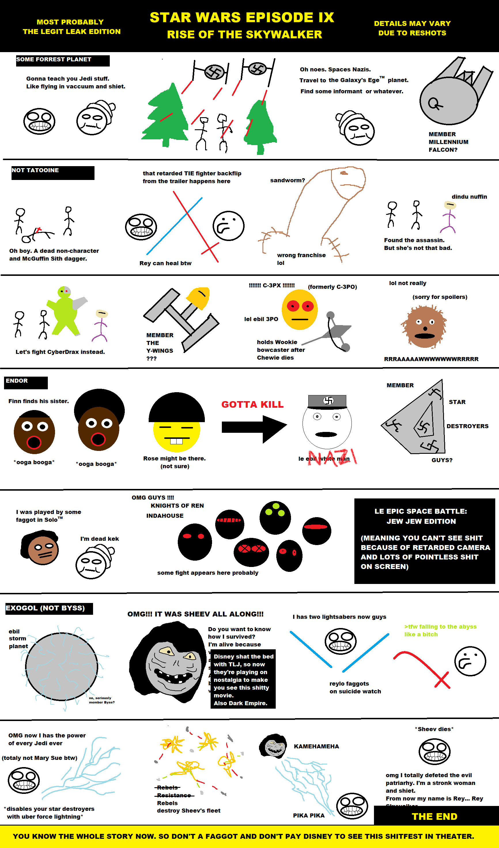 Друзья, вам не кажется что вы заигрались, а? Ну давайте разберем по частям, вами написанное. Начнем с того, что не стоит читать эти сливы. Складывается впечатление, что вы молодые, истеричные, контуженные и обиженные жизнью инцелы, которые все легко воспринимают за чистую монету. Вот сто раз наверное это уже говорили, но не надо верить утечкам. Потому что если поверите, то испортите все впечатления, и испортите их всем в треде. Могу вам и в глаза это сказать, готовы приехать послушать? Вы уже совершенно ничего не замечаете в своем ямном угаре. Остановитесь и будьте звачерами. На r/starwarsleaks лучше не лезть. Это не то. Это не Фуслс и даже не Supershadow. Вся та хуйня на реддите написанная - это простое пиздабольство, рены вы комнатные. От того, что вы много их обсуждали, жизнь ваша лучше не станет. Есть Лукасфильм, который реально работает, не нужно подрывать доверие к нему. Потому что последствия будут самыми печальными. Придумывать сливы - не мешки ворочать. Много вас таких к декабрю разбомбилось. Про таких как вы говорят: Кеннеди не хотела, Абрамс не старался. Вникайте в моё послание вам, постарайтесь проанализировать и сделать выводы для себя. Я вполне понимаю что данным сообщением вызову дополнительный интерес, но хочу сразу предостеречь пытливых – стоп. Остальных просто закопает мышь...
