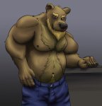 Получается как будто на тело свет падает ровно сверху, а на голову - сбоку. Так же, сбивает с толку отсутствие теней на шее. Создаётся впечатление, что это ровная поверхность. Попробуй на его левой стороне головы и шее использовать полутени, которые ты использовал на его левой бицухе. Тень под подбородком чуть ослабь и увеличь примерно в 2 раза от нынешнего размера. Ещё было бы неплохо, чтобы в кадр попала часть лобка (https://e621.net/post/show/235410 волосы густые, от пупка вниз до края пресса).