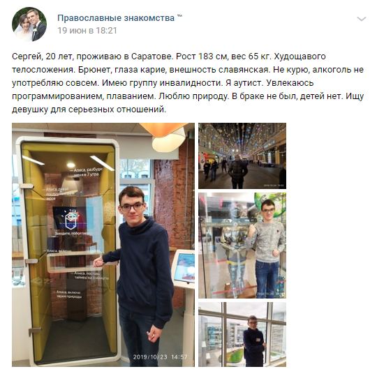 На дейтинг-сервисе зарегистрируется только конченый человек. А уж на православном-то дейтинге, блядь, даж не знаю... Это, вроде как антидвачер такой, не в смысле, красивая успешноблядь 300к/с, а что-то настолько же убогое, но с диаметрально противоположным алайментом. Хорошо, что невозможно представить обстоятельства, при которых эти два убожества встретятся, они же аннигилировать друг друга должны при встрече, ёбнув, как тактическая ядерка.