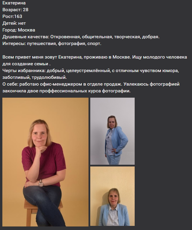 p.s. публиковала анкету в январе,эти 5 месяцев общались с м.ч. через интернет,но наше общение стало похоже на "привет,как дела" раз в 4 дня и все . Надо двигаться дальше . Лучше бы он раньше сказал,что ему это общение не нужно... Поэтому прошу,не пишите ,пожалуйста,если вам просто скучно или вы еще не определились чего хотите в жизни :)