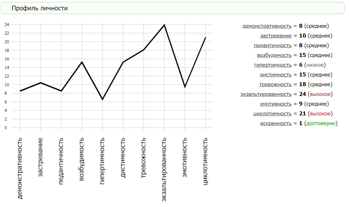 "Циклотимность : 21 (высокое) Реалист, терпимо относится к недостаткам окружающих, не склонен противопоставлять себя другим. В периоды подъема общителен и приветлив, легко знакомится с новыми людьми и находит со всеми общий язык. В период спада весь мир может быть окрашен в мрачные тона."