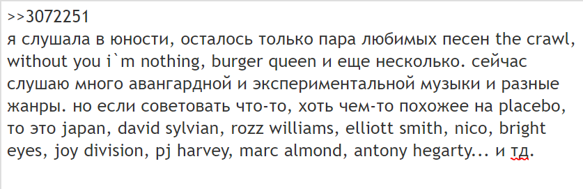 >>3072251 Opeth, Porcupine tree, Tool, King Crimson, Tiamat, Pink Floyd, Iron Maiden, the Cure, God is an Astronaut, Massive Attack, RHCP, Lana Del Rey, Mogwai, My Sleeping Karma, Rapoon, ГрОб .............