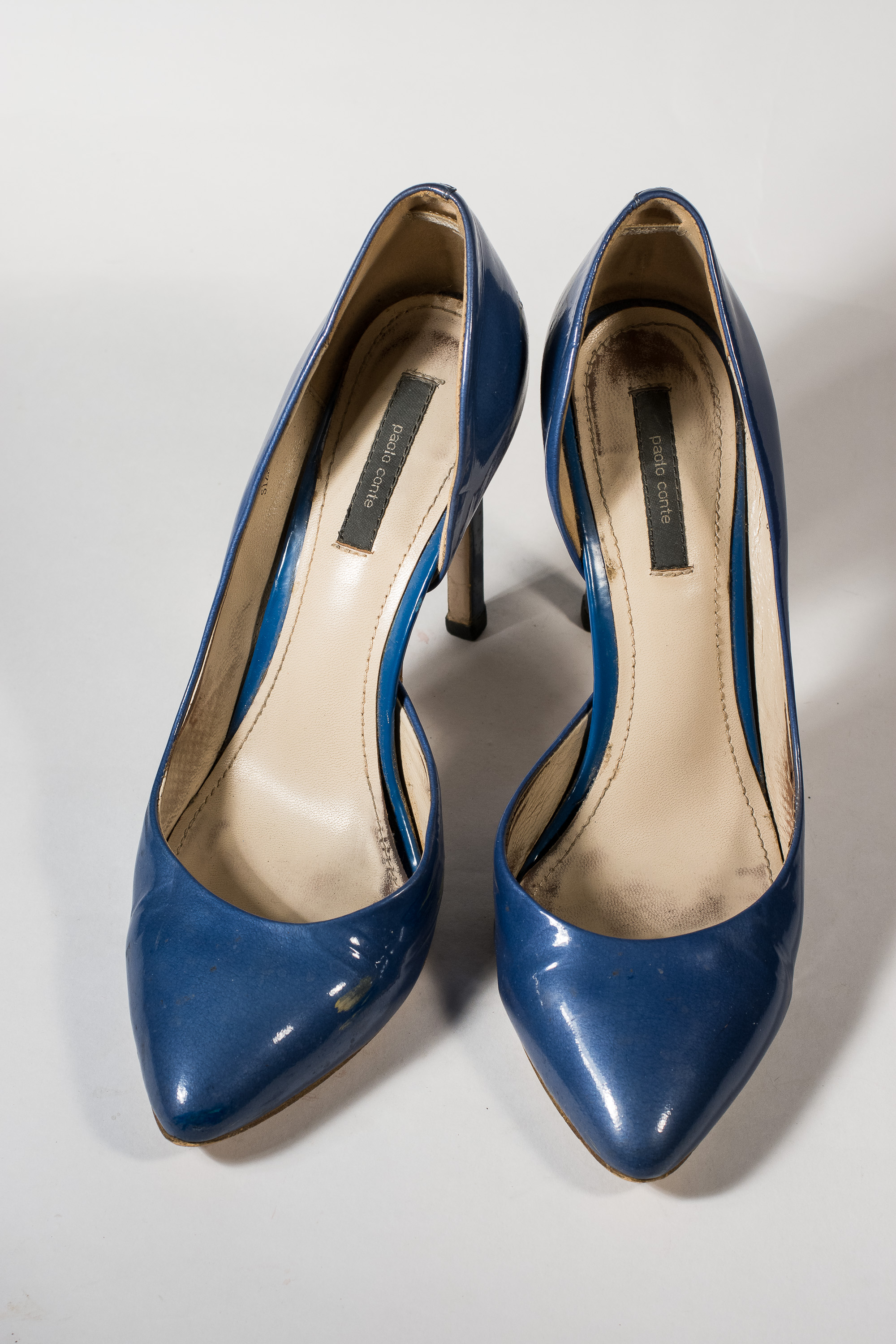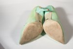 Вторая пара: бирюзовые лодочки на высокой тонкой шпильке. Пахнут они слабее,чем предыдущие, хотя по состоянию стелек видно, что носила она их не меньше.