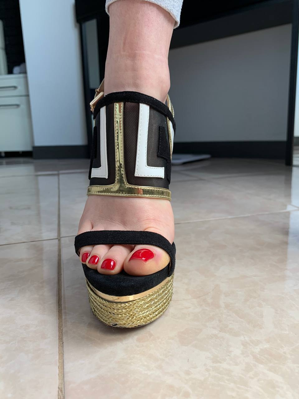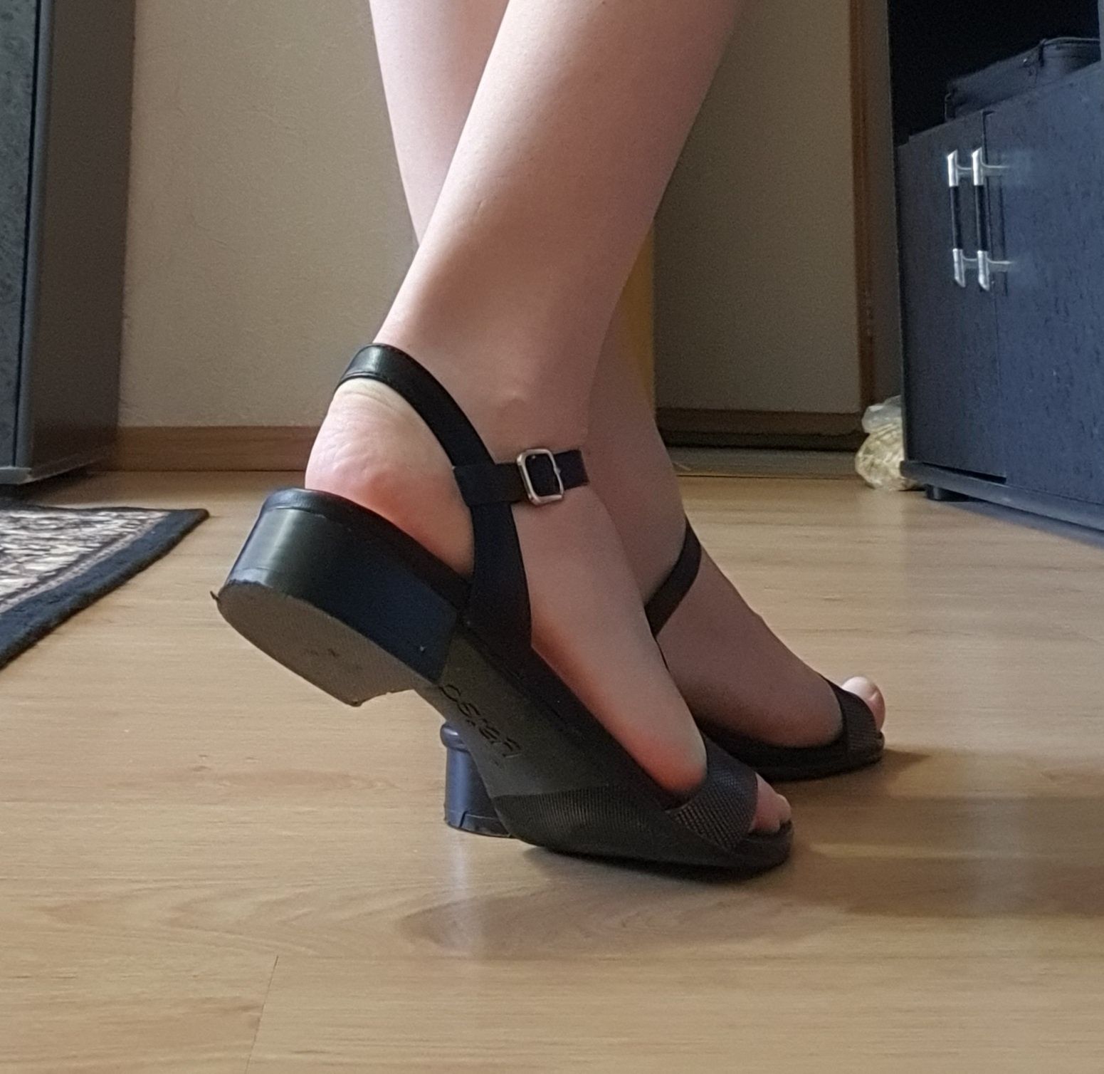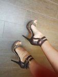 Не самые б/у босоножки из моей коллекции. Но мне удалось уговорить тянку , которая их продавала, примерить их в момент передачи (под предлогом чтобы убедиться что за время хранения босоножки не сели). Так что легкий запах они сохранили. Очень доставляет играть в них членом и затягивать его ремешками.