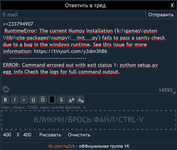 Так блять ну установил я визуал 14.0,дополнительные компоненты тоже,если ошибку с модулям решил а в итоги нихуя ModuleNotFoundError: No module named 'numpy' ---------------------------------------- ERROR: Command errored out with exit status 1: python setup.py egg_info Check the logs for full command output