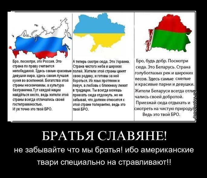 Ээээ, украина-беларусь, давайте дружить, я разрешаю. Мы ж типа братья, ясно дело я РУУУСКИЙ великий богоизбраный большой брат, а вы типа такие ну тоже там какие-то братья со своими смещными языками и придумаными флагами.