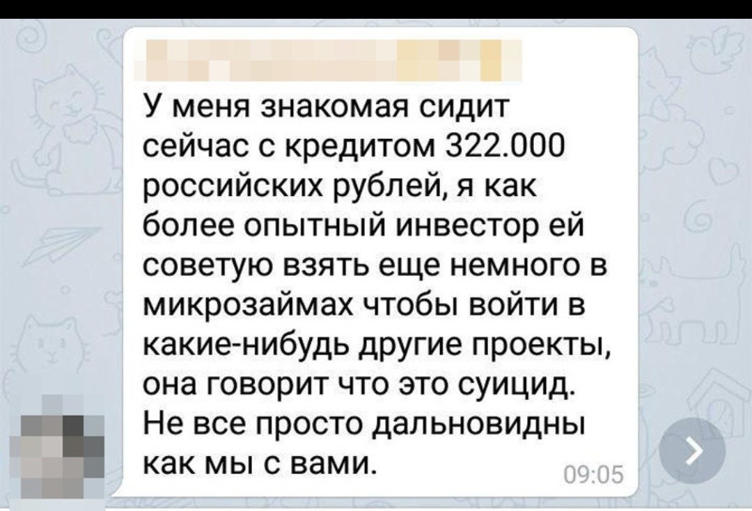 Списавшись с Васей, и спросив как у него дела, он пояснил, что всё плохо. Против его заработка в компании "Кэбери" теперь государство, которое не дает честно зарабатывать ему деньги. Как итог - выплаты компании прекратились и он не знает, что ему делать дальше. Суть в том, что пока ему шли выплаты, он и не старался особо гасить кредит, так как думал, что деньги еще будут, и жил на широкую ногу. Как итог - долг перед банком около 1 200 000 рублей.