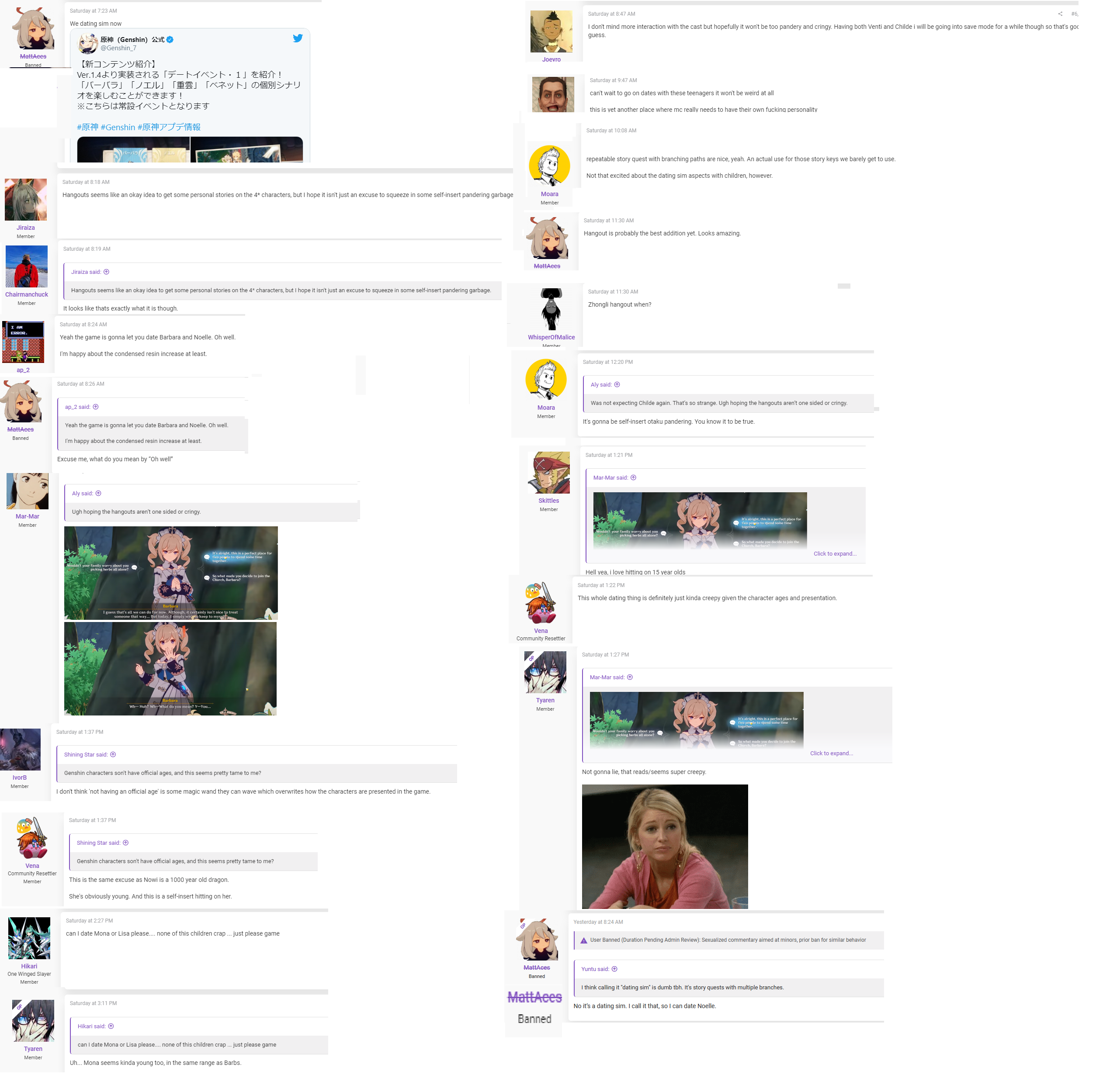 Встречаем байду, она отправляет нас. Там мы знакомимся с местными болванами и вражиной. Аяка принцесса, так что будет навроде кеки/нинки, но они вообще были четвёрками. К тому же грёбаный служитель баала. Ещё окажется, что вражиной была она, а баал ничего плохого не хотела. Итого местные дегенераты, принцесса, баал, возможно и вражина. Не вижу причин пихать аяку, сигнатурку нихонии, в начале. Вообще есть некий смысл пихнуть аяку в стандартный баннер не давая ей ивентовый в принципе.