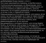 Позиция адеквата (Без шапок из фольги и прочего ЗОГа): 1. Эффективен ли Спутник? Скорее всего - да, хоть и ВОЗ не зарегистрировал вакцину в COVAX'е, а статья в Ланцет - не официальное подтверждение клинической эффективности - мы же не ориентируемся на журнал Science, например, как на истину в последней инстанции. Однако, косвенные признаки, а в частности закупка вакцины развитыми и развивающимися странами говорит о том, что эффективность у данной вакцины есть и она удовлетворительна. 2. Есть ли у Спутника побочки? Определенно да. В том числе, вызывающие летальный исход. 3. Есть ли доказательства того, что Спутник предотвращает среднее и тяжелое течение болезни? Нет, таких доказательств нет. Нет ни одного испытания, которое бы доказало эту теорию. Все что мы слышим - ничем не подкрепленные слова российских специалистов. С научной точки зрения, это не доказывает ровным счетом ничего. 4. Несет ли государство какую-либо ответственность за испытание вакцины на мне? Нет, не несет. И это очень тревожный звоночек, так как перед вакцинацией ты подписываешь отказ от ответственности. Учитывая, что клинические испытания сократили на полтора года, по факту ты работаешь добровольцем-испытателем, только при этом ты и твоя семья никак не защищены от последствий, которые могут наступить вследствие побочек. 5. Является ли коронавирус настолько страшным заболеванием для лиц младше 39 лет? Нет, доля смертей от коронавируса для данной возрастной группы ничтожно мала.