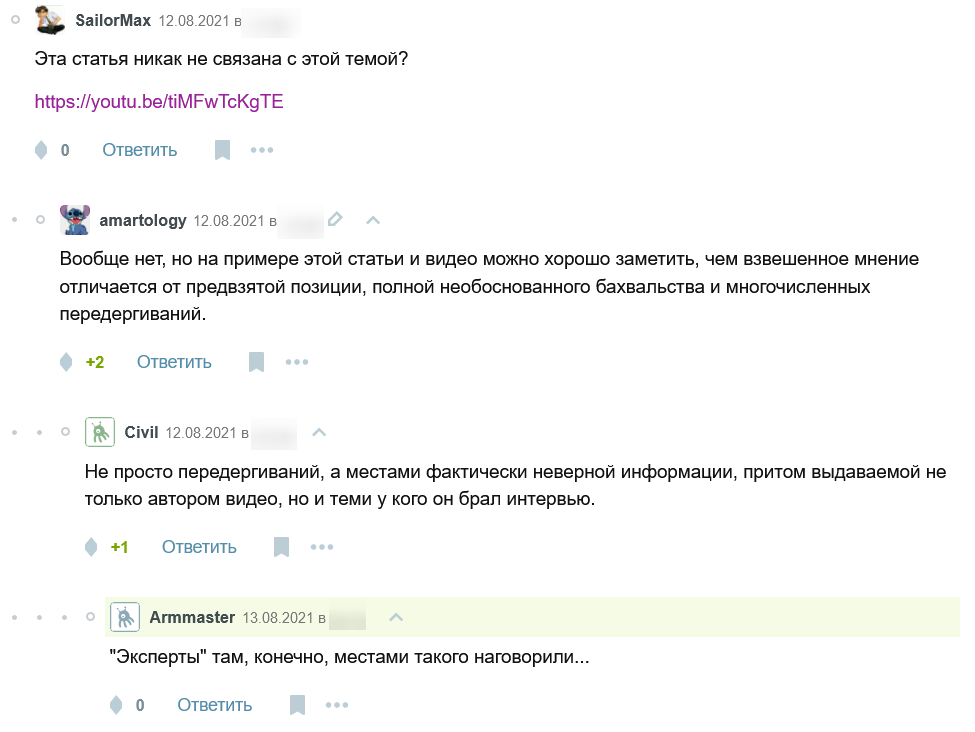 ОП попросил аргументы за и против @ Его назвали хохлом @ Его назвали порриджем @ Заявили, что надо делать своё, чтобы было своё, а кто этого не понимает, тот долбаёб @ В треде запостили прогнозы развития, напоминающие фантазии из советских подростковых научпоп журналов о будущем советской науки @ За сотню постов один единственный аргумент (о том, что intel me это блядство)