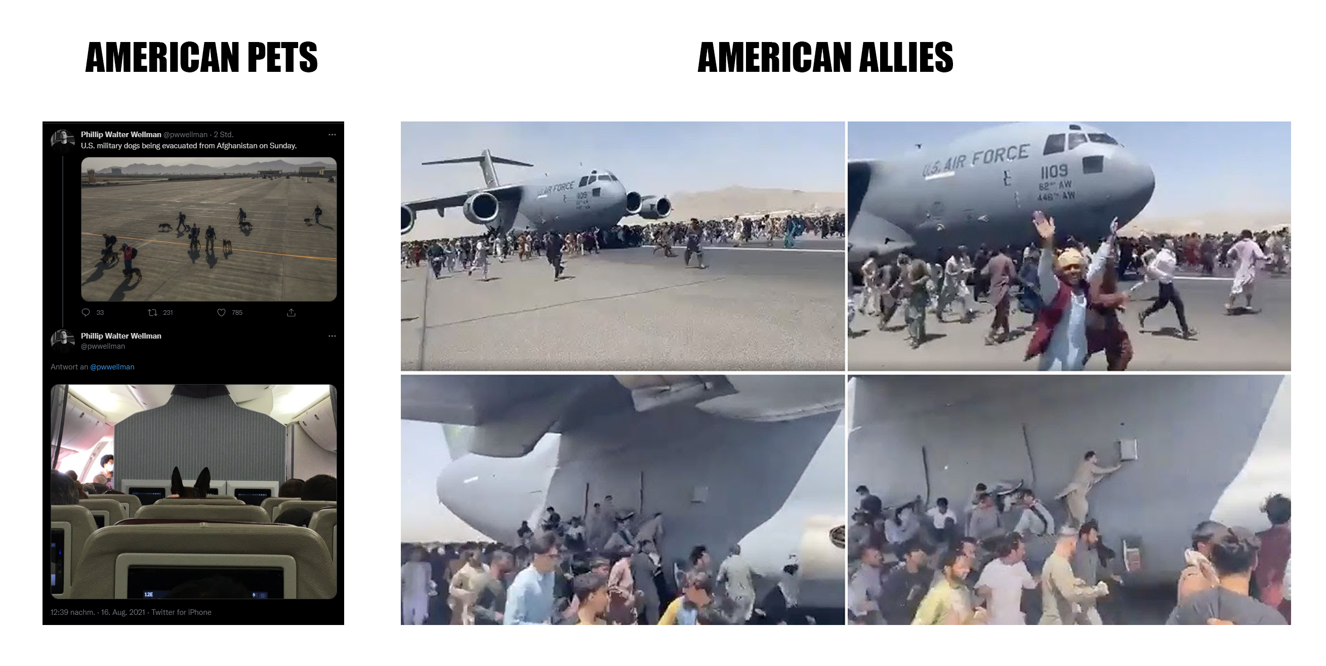 В этом треде наблюдаем как на наших глазах происходят военные преступления в аэропорту кабула уровня 11 сентября, как жизни людей обесцениваются, как люди хватаются за шасси взлетающих по впп полной людей при атс 0 самолётов нарушая нормы и международные правила и законы и уставы