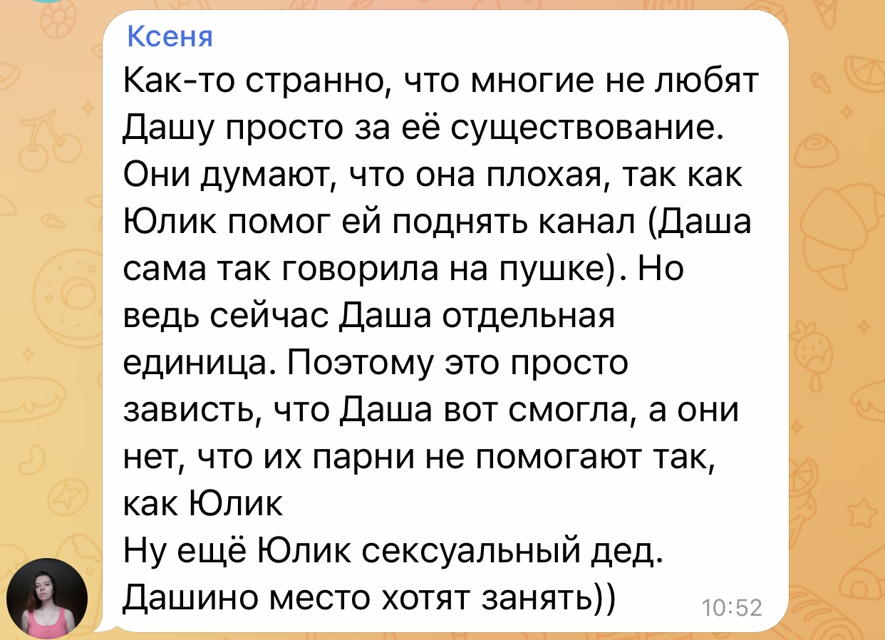Я вообще не понимаю нахуя постоянно это обсуждать, реально что ли больше ничего в жизни не происходит, или, может, так хочется чтобы хомяки пожалели нежную нашу. Типа ладно обсудить когда тема зашла со знакомыми, а так 24/7, еще и рыгать постоянно, это странно. Она как будто специально так себя ведет, может думает что это смешно и делает её ближе к хомякам, типа она такая открытая и искренняя не то что все остальные блогеры.