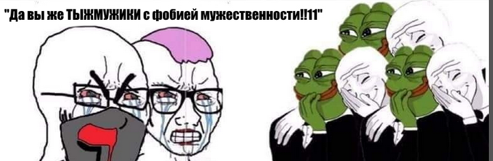Далее кину свои рассуждения под спойлер Можно рассмотреть типичного вегачера, для удобства назовем его ТЫЖМУЖИК. Омежный вегачер у мамки под юбкой с чего-то решил, что он тот самый ТЫЖМУЖИК, а ТЫЖМУЖИК в коллективном бессознательном страдающих фобией мужественности это такой тупой агрессивный кусок говна, якобы сильный альфа самец, который по дефолту унижает все вокруг, что не вписывается в парадигму ТЫЖМУЖИЧНОСТИ, для которого проявлять любые эмоции кроме негативной грубой силы доминирования - отклонение от ТЫЖМУЖИЧНОСТИ, то есть имеется стойкий стереотип ТЫЖМУЖИКА - думает о сексе постоянно (омежный двачер, страдающий маскулистической фобией не может не думать о сексе, отсюда треды про раздетых/одетых тян), унижает слабых просто потому что альфа (прямо как в школьные годы унижали самого омежку двачера, отсюда все негативистские треды в целом, где кого-то или что-то с первого поста начинают хуесосить), ненавидит геев, потому что очевидно отклоняется от парадигмы ТЫЖМУЖИКА, ненавидит женщин и их права, что очевидно почему, и так далее, можно просто брать любой тред /v/ и сразу чекать на наличие фобии мужественности.
