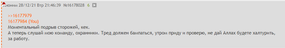 А теперь слушай мою команду, охранники. Тред должен бампаться, утром приду и проверю, не дай Аллах будете халтурить, за работу.
